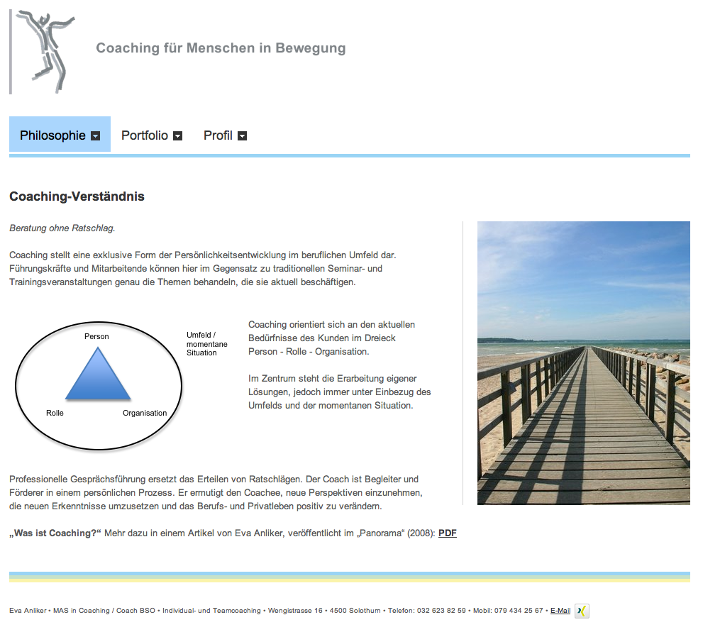 Die Webseite "evaanliker.ch" hat ein neues Gesicht bekommen. Ein Webdesigner in St.Gallen, eine Projektleiterin in der USA und eine Kundin in Solothurn; das ist das Ergebnis.